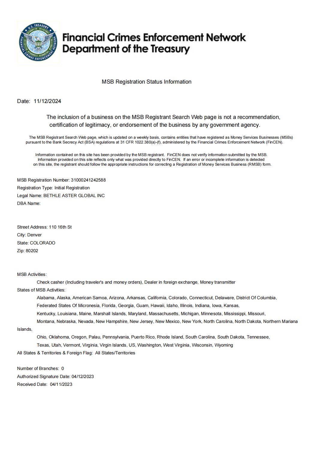 : BETHLE ASTER GLOBAL INC has obtained the MSB (Money Services Business) license issued by the US Treasury Department FinCEN, and has the qualifications to legally operate virtual currency trading services in the United States!