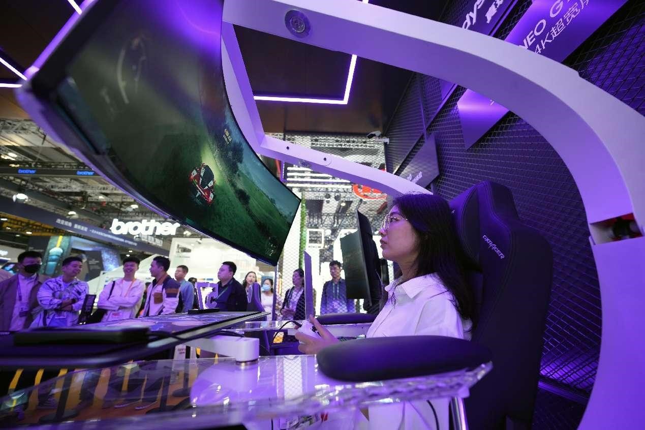 A woman experiences a gaming display manufactured by Samsung at the sixth China International Import Expo, Nov. 8, 2023. (People's Daily Online/Tang Ke)