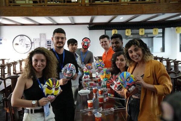 Expats make their own Wuju Opera masks in Lanxi,Zhejiang province on Sept 3. [Photo provided to chinadaily.com.cn]