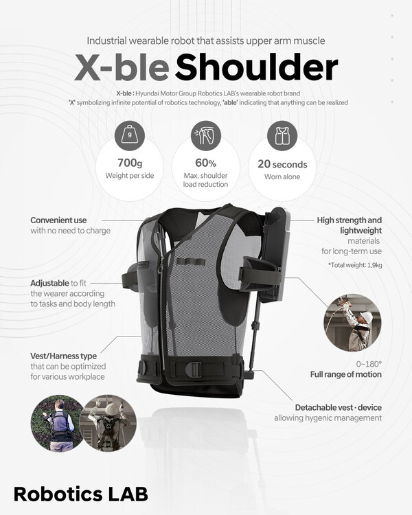 The X-ble Shoulder,the first product in the X-ble line,is an industrial wearable robot developed by Hyundai Motor and Kia's Robotics LAB. When used in 'overhead work' where the arm is raised,it can assist the user's upper arm muscle strength and reduce the burden on the upper extremity musculoskeletal system.