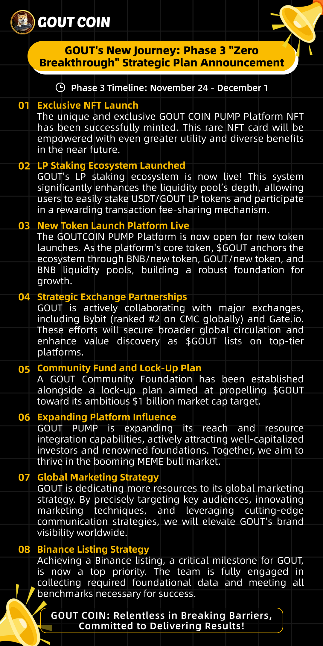 With a global vision, GOUT Coin aims to expand its ecosystem, strengthen technical innovation, and inject more vitality into the blockchain market. We look forward to seeing GOUT Coin achieve more milestones and establish itself as a benchmark project in the industry.