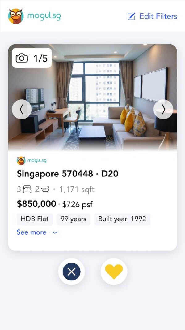 The web-based platform aggregates over 100,000 property listings from major Singaporean real estate portals,99.co,and MOGUL.sg,and lets users easily keep track of their favourites,saving hours from navigating multiple websites.