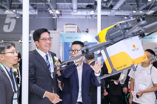 (2024) Michael Wong Wai-Lun,Acting Financial Secretary of the Hong Kong Special Administrative Region Government,participated in a VIP tour where he engaged with an exhibitor who provided an introduction to their drone product.