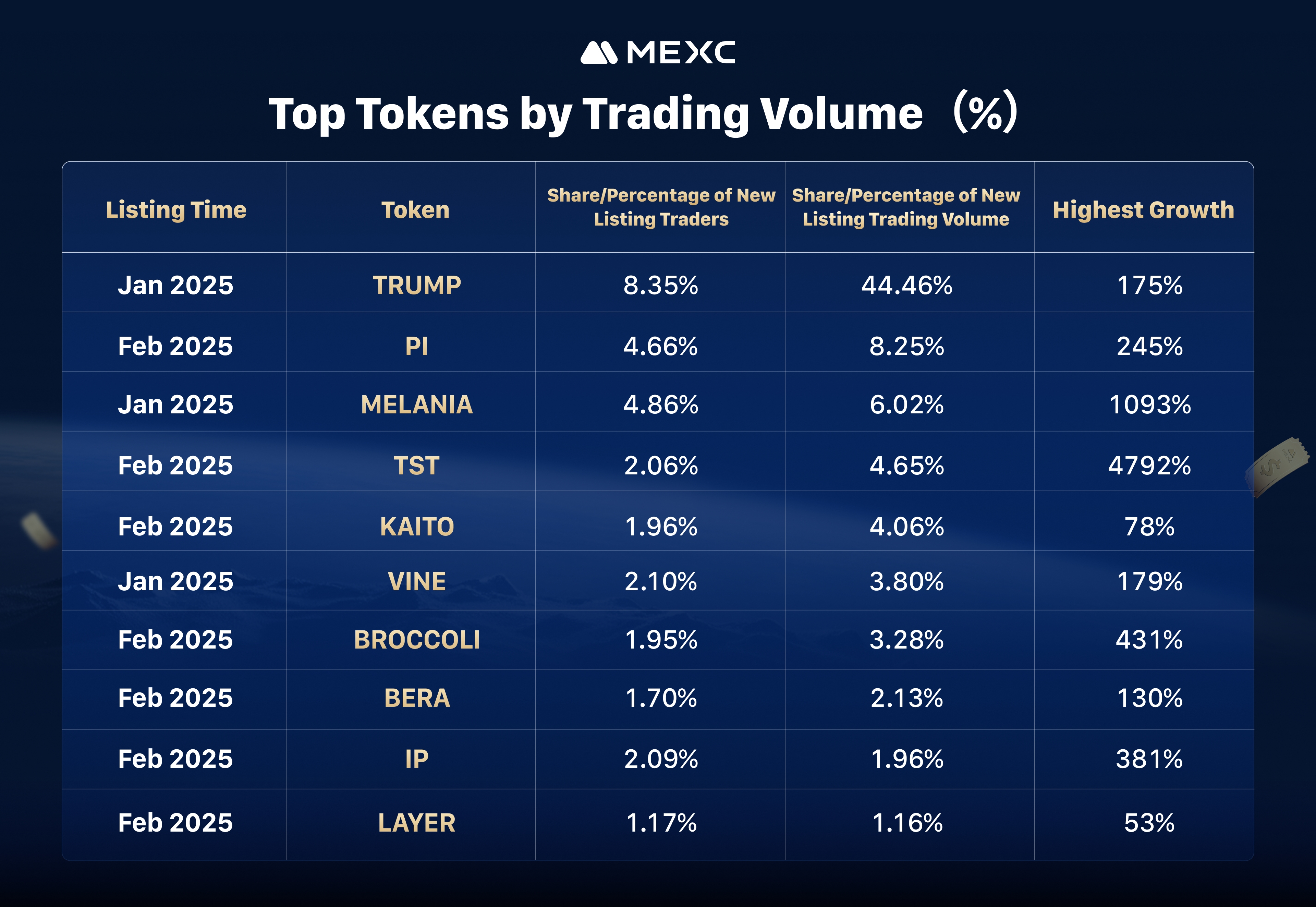 The findings reflect the growing investor appetite for community-driven assets. Among the top 10 new tokens by trading volume, seven were launched in February, demonstrating sustained demand for high-profile listings despite a more subdued overall market trend in January.