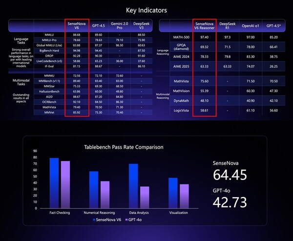 In leading benchmarkevaluations of reasoning and multimodal capabilities,SenseNova V6 achieved state-of-the-art results across multiple metrics.
