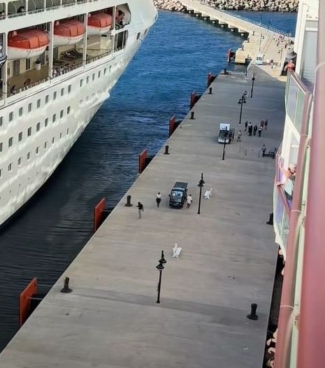 Moments later,a black golf caddy could be seen speeding along the pier towards the ship with the final two passengers – but it was all too late as the ship had already left.