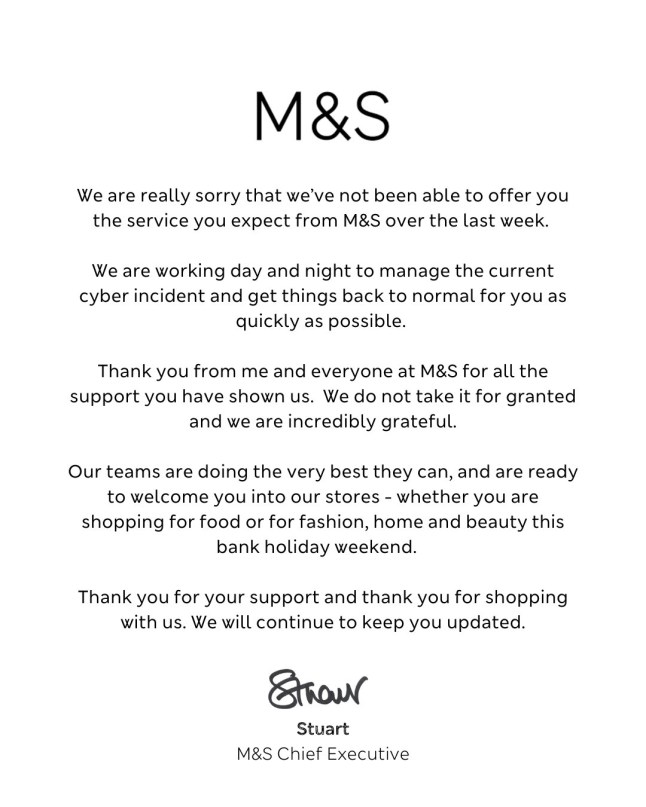 M&S publicly acknowledged a ‘cyber incident’ and began taking internal systems offline to contain the breach. This marked the first official confirmation of a serious issue,with a statement to the stock exchange.  Wednesday,April 23: Click and Collect and Contactless disruption
