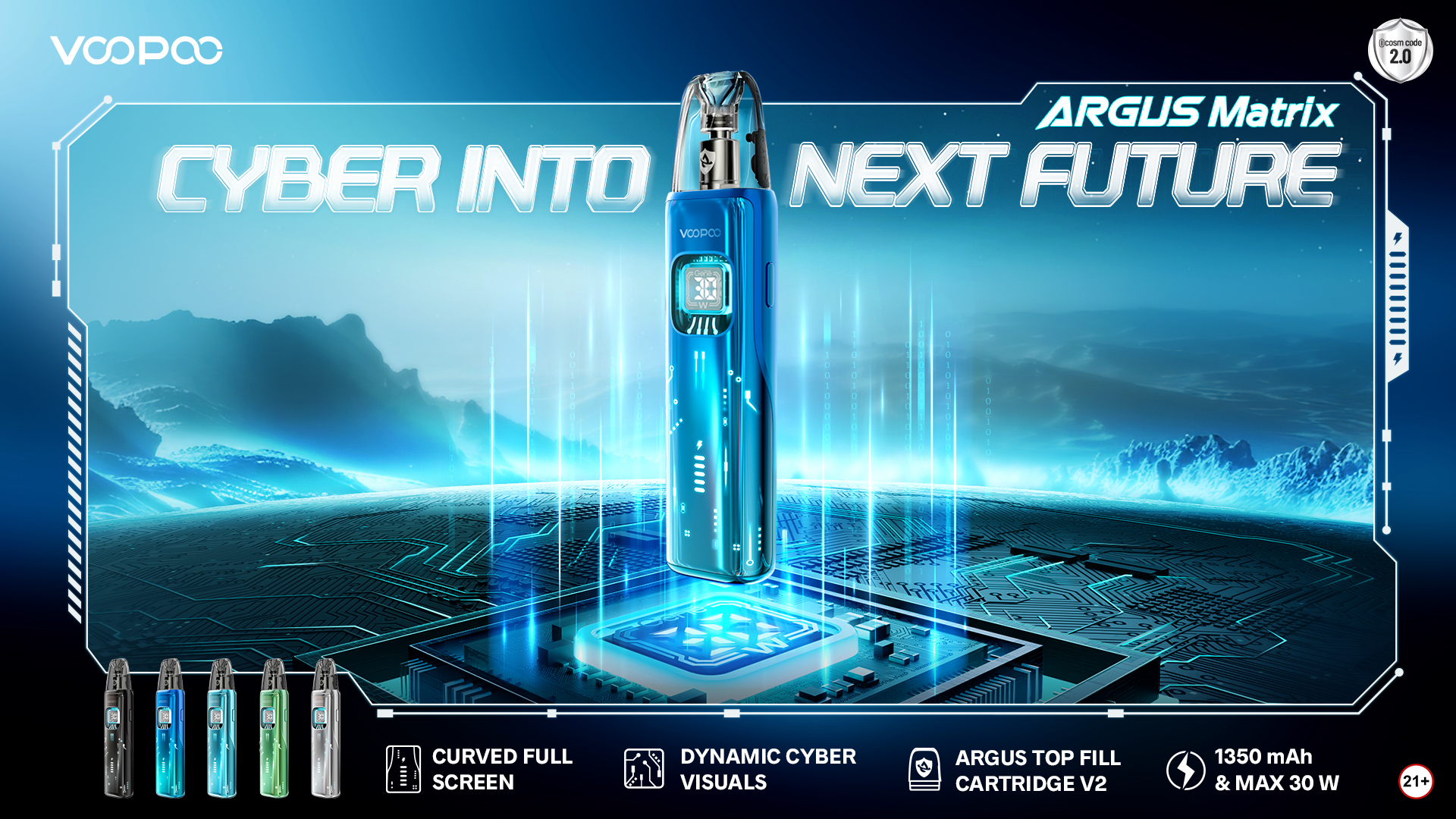 The future of vaping has a new shape: VOOPOO, the industry-leading brand, redefines innovation with the ARGUS Matrixthe first POD to feature a curved full screen and dynamic cyber-futuristic visuals that revolutionize vaping. With its sleek, cyber-aesthetic design, the ARGUS Matrix offers a truly futuristic vaping experience, combining style and substance like never before.