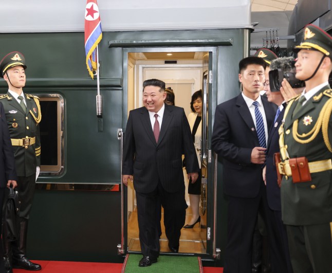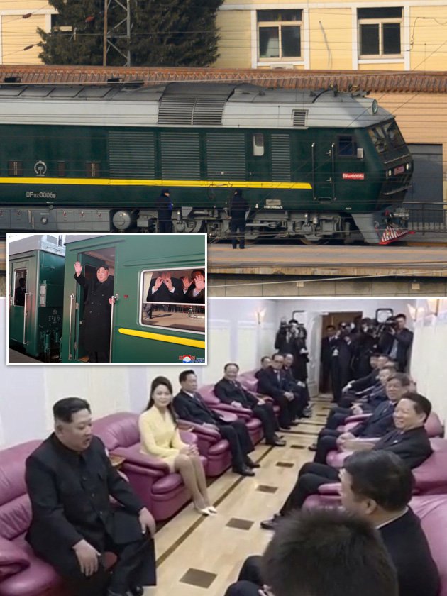 Kim Jong Un has been photographed stepping off his family’s trademark green armoured train,an aging symbol of his dynastic rule,as he lands in Beijing.