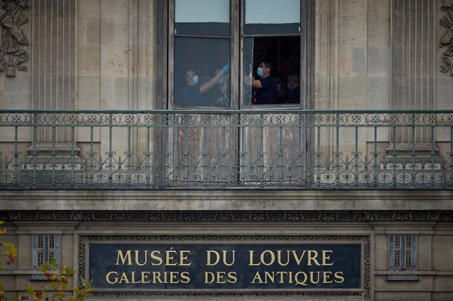 Crime scene officers at the broken window of the Louvre’s Denon Wing (Photo by Kiran Ridley/Getty Images)